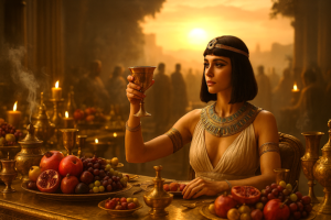 “Zamanı selamlayan bir kadeh…” Kleopatra, gün batımında altın sofranın başında oturuyor.Elinde bir kadeh, bakışları uzaklara — belki Tanrılara, belki tarihe…