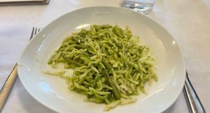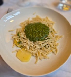 Trofie al pesto, taze fesleğenin temiz kokusu, çam fıstığının yağlı dokusu ve peynirlerin dengesiyle hâlâ eski reçeteye sadık.