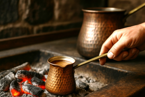 Köz üzerinde kahve pişirirken cezveyi tutan usta eli, Diyarbakır kahvehanelerinde kuşaktan kuşağa aktarılan ısı yönetimi bilgisini ve kahve hazırlama ustalığını somut olmayan kültürel miras bağlamında görünür kılar.