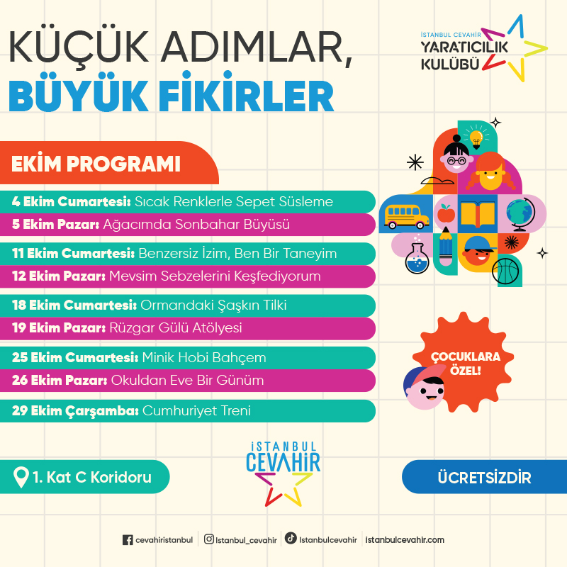 Ekim ayı boyunca İstanbul Cevahir’de gerçekleştirilecek atölye çalışmaları, çocukların farklı konularda yaratıcılıklarını ortaya koymalarına ve kendilerini özgürce ifade etmelerine imkan sağlayacak. Renkli ve ilgi çekici içerikleriyle dikkat çeken bu etkinlikler, hafta sonlarına keyif katacak.